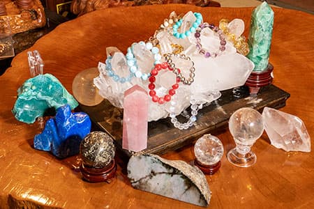 水晶ホールは、商品として販売する前の全ての天然石をここに一晩置いて綺麗に浄化し、正に天然のままの石たちをお客様にお渡しするために作られました。水晶を初め、紫水晶、紅水晶、黄水晶、黒水晶などが壁一面に貼り付けられ、あたかも天然水晶の曼陀羅図がデザインされたかのごとく荘厳にみえます。